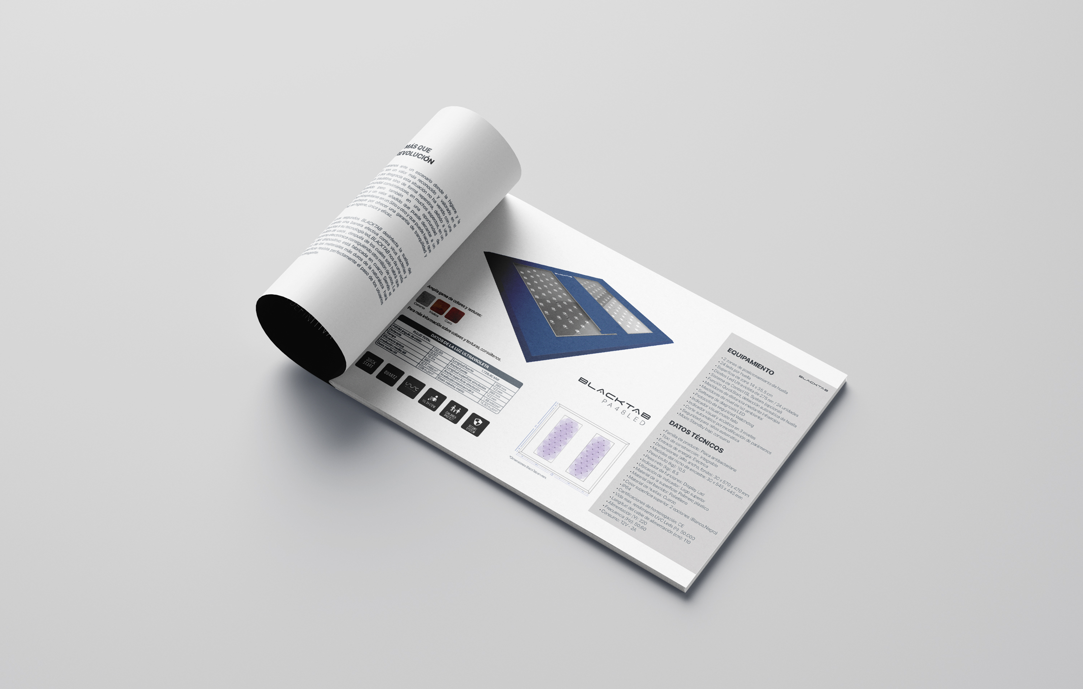 Dossier horizontal a modo de revista de 8 páginas para el producto «BlackTab» de la empresa Luvoratory. Llevado a cabo con los colores corporativos del producto, destacamos la información más relevante a través de eslóganes e imágenes, haciendo un recorrido desde el origen del producto, su función, utilidad y finalizando con sus datos más técnicos.