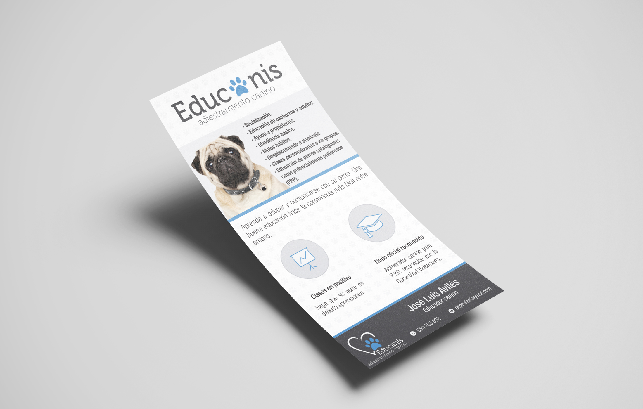 Diseño de logotipo, tarjetas de visita y flyers para la empresa de adiestramiento canino «Educanis». Trabajamos en tarjetas de visita y flyers con diseños atractivos y dándole un toque de frescura y familiaridad a la marca del cliente. Se nos transmite la importancia de realizar un diseño limpio y que facilite la lectura de la información, destacándonos el valor que tiene el adiestramiento canino y lo que valoran sus propios clientes.