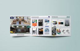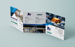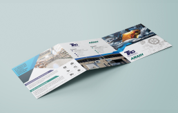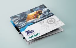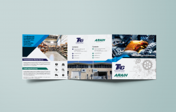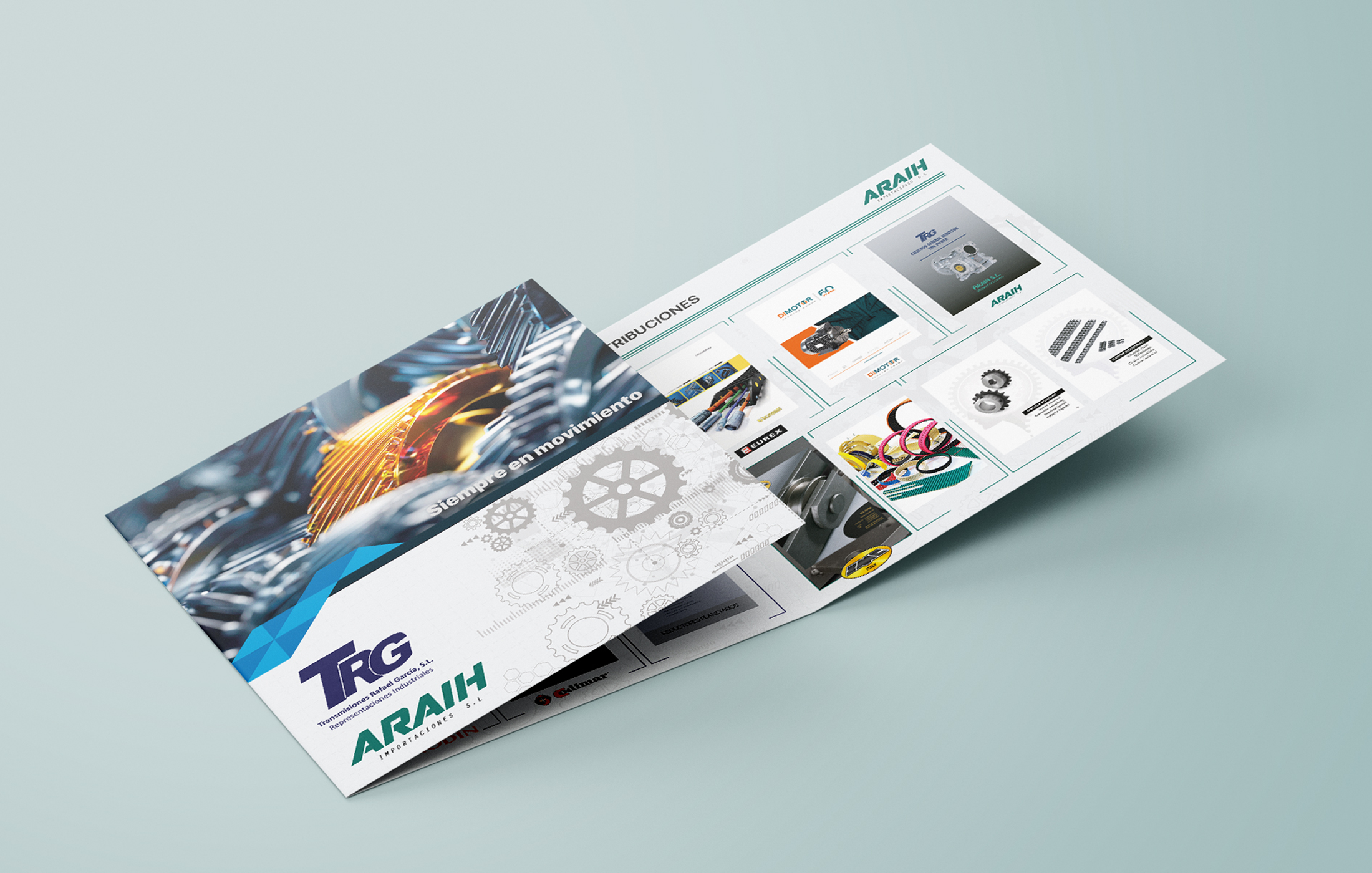Tríptico en formato cuadrado para la empresa TRG / ARAIH. Empresa especializada en rodamientos, engranajes y piezas de mecánica. Diseñamos este tríptico para venta con la información más importante de la marca, tanto de su empresa a nivel corporativo como de calidades de sus productos. Tenemos en cuenta que será información para dejar a sus clientes y que es una empresa B2B, por lo que tanto la estructura como el formato debe quedar explícita con los aspectos que más interesan a su tipo de clientes, así como su forma de contacto.